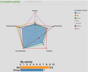 Jedes Gruppenmitglied kann also die eigenen Aktivitäten und die der anderen beobachten und sein Verhalten danach ausrichten – vorausgesetzt, die Studierenden haben ihren Privacy-Button ausgeschaltet. Eine Teilnehmerin, die beispielsweise besonders oft die Initiative ergreift, kann so einen anderen Teilnehmer darauf hinweisen, dass er nun an der Reihe ist.