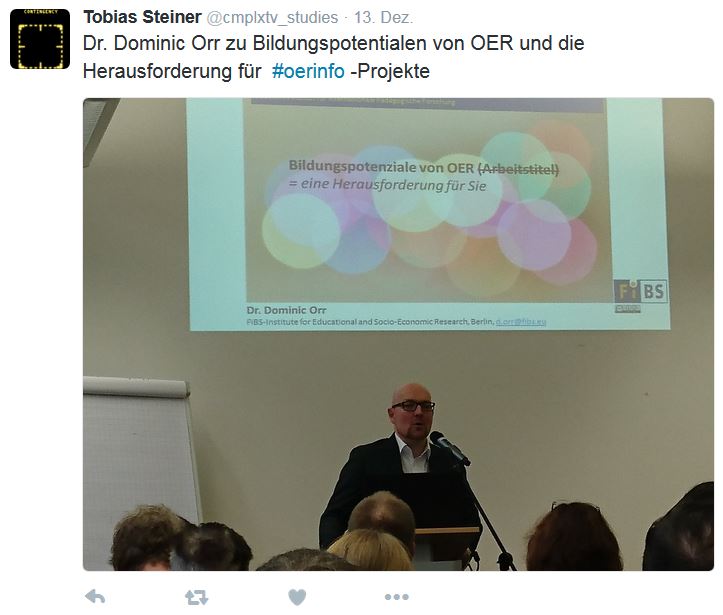 Dominic Orr vom Forschungsinstitut für Bildungs- und Sozialökonomie hält einen sehr guten Impulsvortrag zum Thema „Bildungspotenziale von OER.