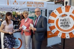 In der Regel ist bereits vor der Ankunft des ALFA-Mobils viel Vorbereitung gelaufen: Die lokale Tageszeitung hat den Besuch zwei, drei Tage vorher angekündigt, in kleinen Orten erscheint ein Artikel groß auf der Titelseite, in großen Städten muss man um die Aufmerksamkeit kämpfen. Im Idealfall erreichen wir auch das Radio – für Betroffene ein sehr wichtiges Medium. Nach Ankunft und Aufbau wird gemeinsam mit der lokalen Politprominenz, dem Landrat, der Bürgermeisterin, der Bildungsdezernentin und den Bildungsanbietern, die uns eingeladen haben, der Stand im Beisein der Presse feierlich eröffnet. Die erste Stunde dient also der für uns sehr wichtigen Öffentlichkeitsarbeit, erst danach findet die eigentliche Beratung statt. Nach dem ganzen Trubel kommen dann die Leute zum ALFA-Mobil und suchen das Gespräch mit uns.