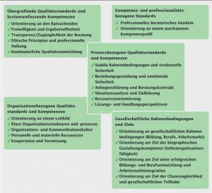 Qualitätsstandards für die Bildungs- und Berufsberatung wurden in Deutschland bisher überwiegend von den professionellen Verbänden der Bildungs- und Berufsberatung und der psychosozialen Beratung erstellt und für ihren Geltungsbereich für verbindlich erklärt (Jenschke/Schober 2017). Im europäischen und internationalen Vergleich hat sich gezeigt, dass die Existenz starker professioneller Verbände mit entsprechenden Qualitätsstandards eine wichtige Voraussetzung für die politische Verständigung über und die Akzeptanz von professionellen Qualitätsstandards sind.